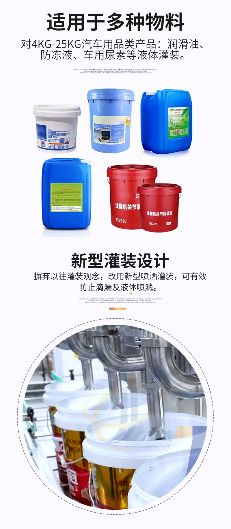 全自動(dòng)稱重式灌裝機(jī)適用于多種物料,對(duì)4kg-25kg汽車用品類產(chǎn)品:潤滑油、防凍液、車用尿素等液體灌裝。