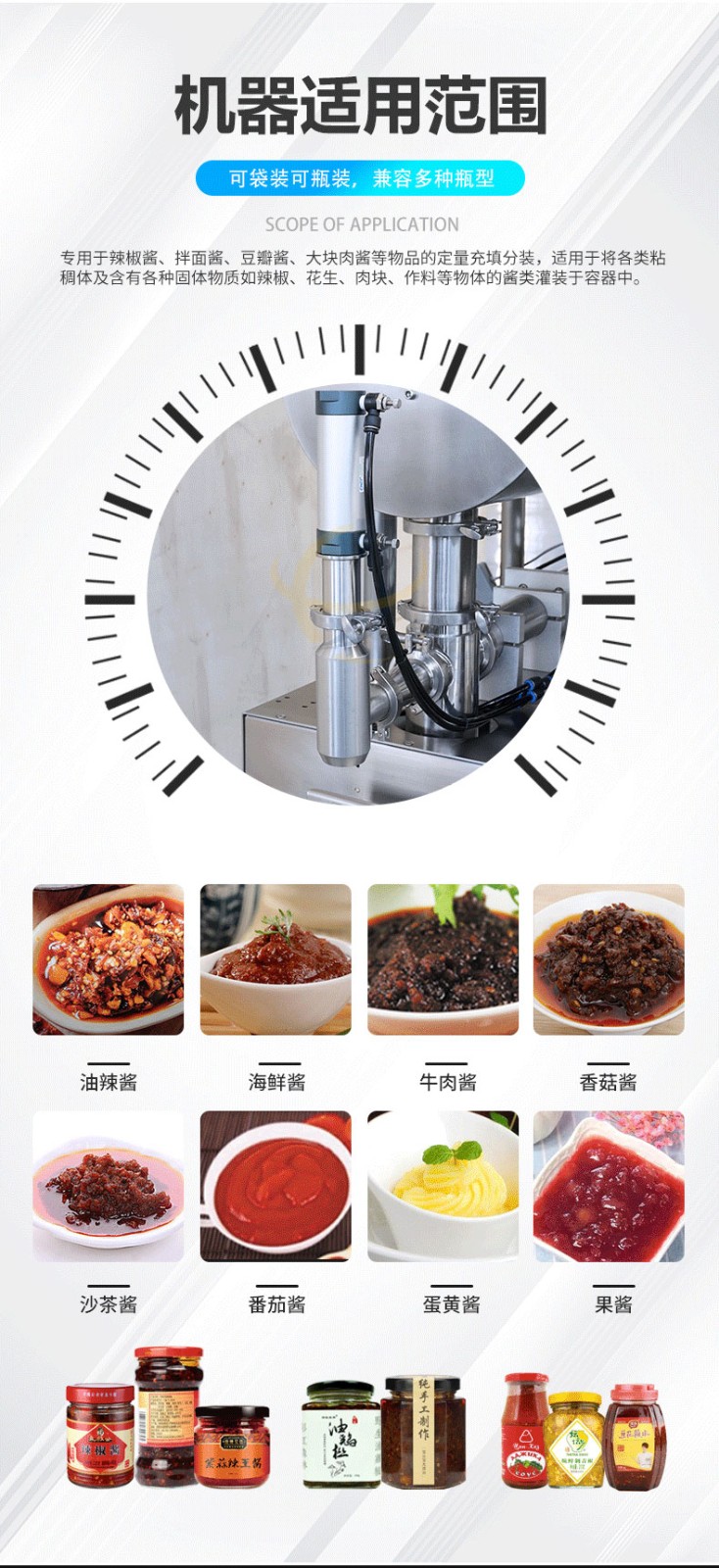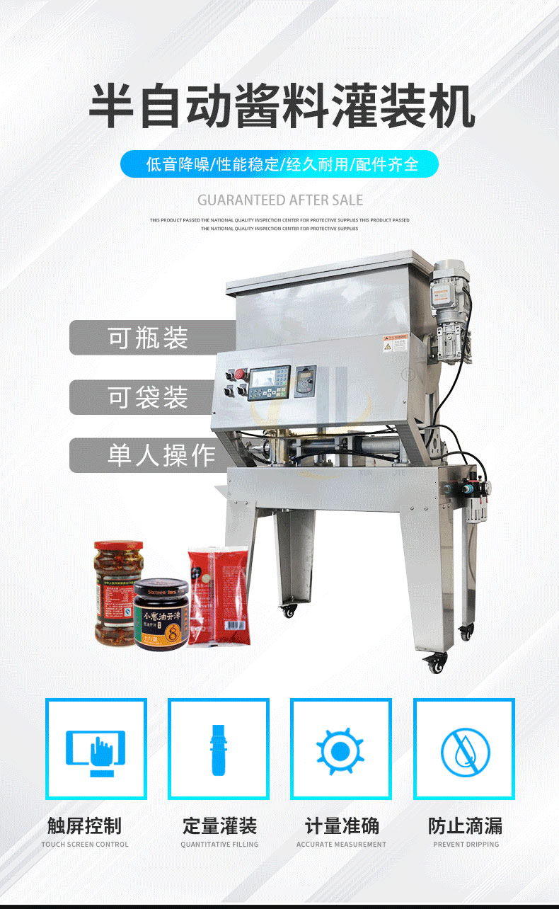 半自動(dòng)醬料灌裝機(jī)適用于辣椒醬、豆瓣醬、拌面醬、大塊肉醬等物品的定量充填分裝,適用于將各類粘稠體及含有各種固體物質(zhì)