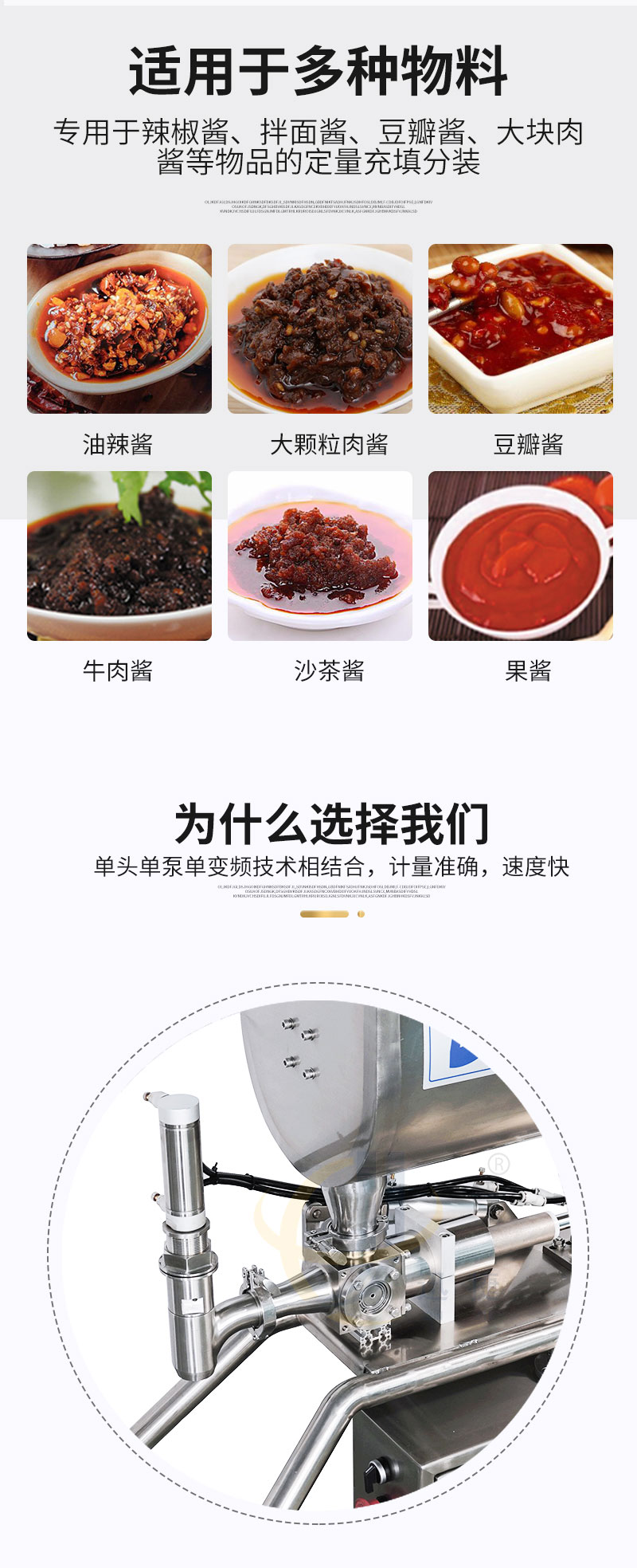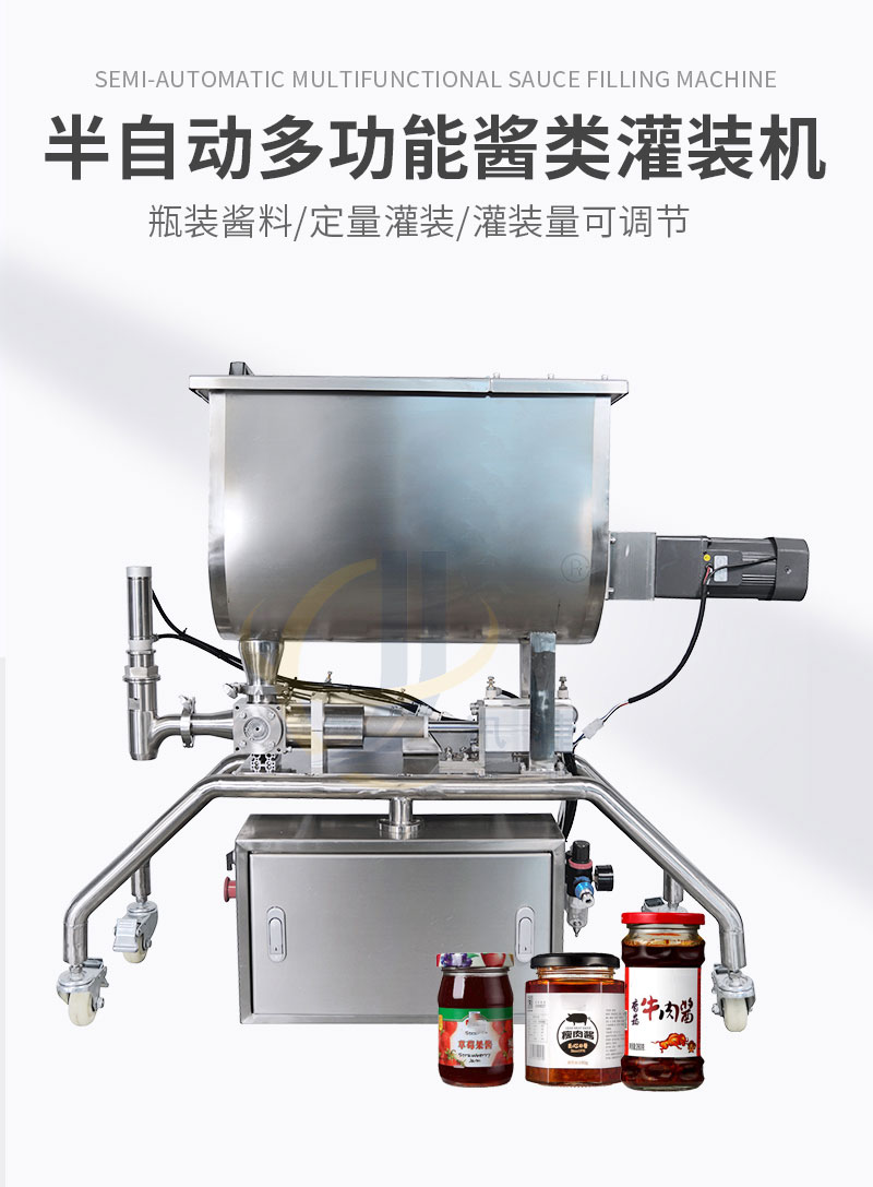 半自動醬類灌裝機(jī)適合于將各類粘稠體及含有各種固體物質(zhì)如辣椒、花生、肉塊、佐料等物體的醬類和油、料分離的火鍋底料等灌裝于各種容器中