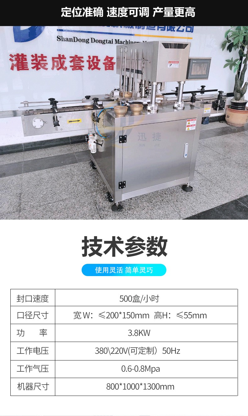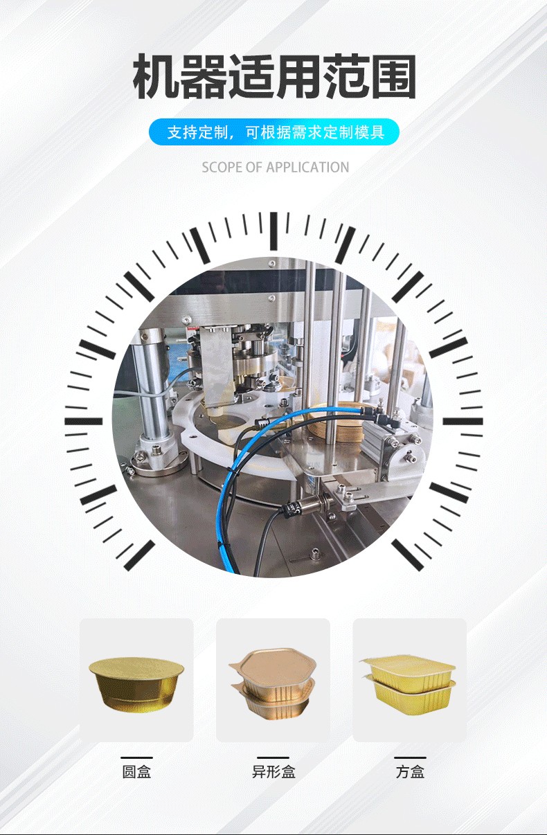 全自動(dòng)鋁箔盒封口機(jī)用途:用于咖喱醬、調(diào)料品、火鍋料、果醬、辣椒醬、醬油醋、番茄醬等杯盒的自動(dòng)灌裝與封口。
