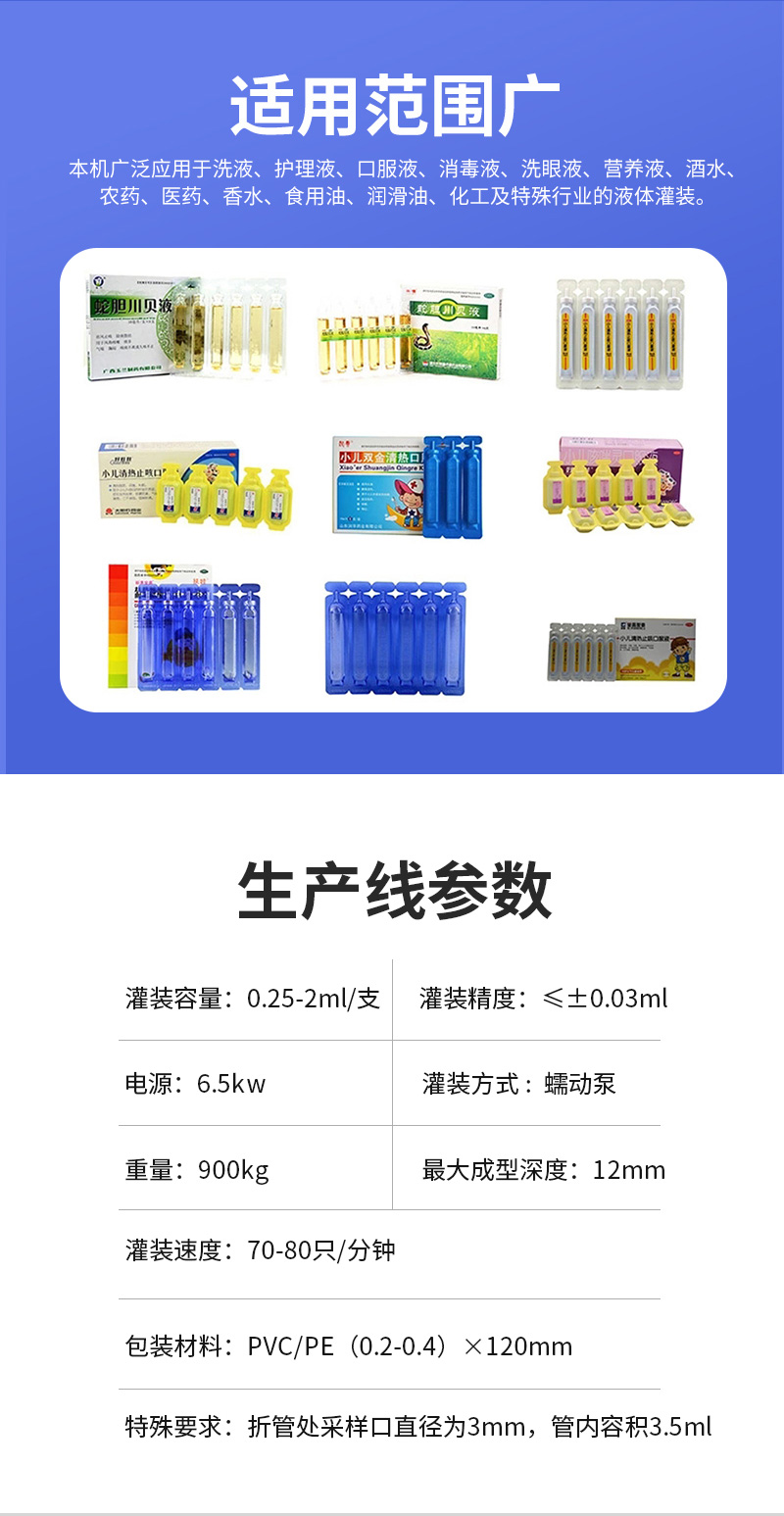 易折試劑管成型灌裝機(jī)廣泛使用于護(hù)理液、口服液、洗眼液、營養(yǎng)液、香水、食用油、潤滑油、化工及特殊行業(yè)的液體灌裝。