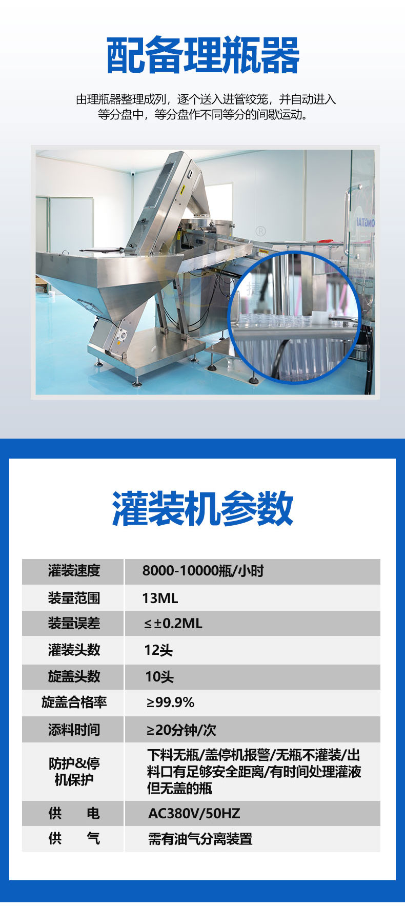 全自動(dòng)診斷試劑灌裝旋蓋生產(chǎn)線由理瓶器整理成列,逐個(gè)送入進(jìn)管絞龍,并自動(dòng)進(jìn)入等分盤(pán)中,等分盤(pán)作不同等分的間歇運(yùn)動(dòng)。