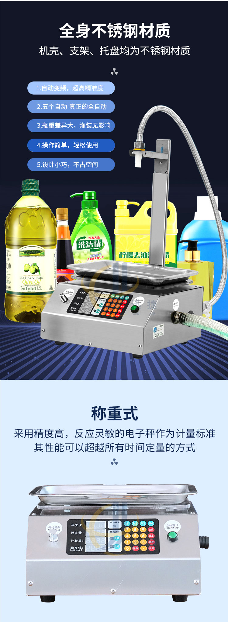 稱重式液體灌裝機適用于30g-15kg內(nèi)的各種常見液體灌裝。采用精度高,反應靈敏的電子秤作為計量標準。其性能可以超越所有時間定量的方式。