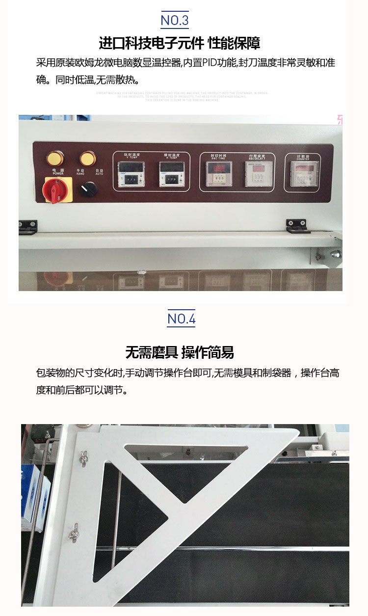 采用國(guó)際先進(jìn)控制元件;封刀采用特殊設(shè)計(jì),封口牢固、不開(kāi)裂、不粘刀;
