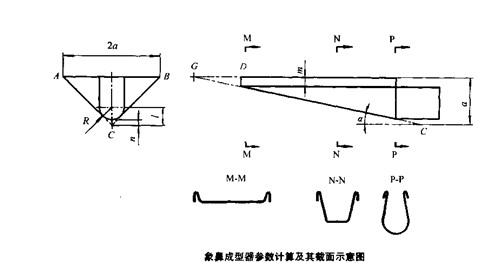 象鼻成型器的制造一般采用不銹鋼薄板,要求外表面光滑乎整。其三角部分和圓弧槽部分可用整塊板料卷曲而成,因?yàn)樗鼈兊恼归_寬度是相等的。下圖所示是象鼻成型器結(jié)構(gòu)及展開圖,沿虛線卷折即可制得成型器,圖中參數(shù)可通過計算加以選擇。