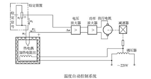 如果將控溫過程中的人工操作 (檢測和調(diào)節(jié)) 換由自動控制裝置完成,則成為包裝機自動控溫系統(tǒng)。如下圖所示,檢測元件熱電偶檢測恒溫箱內(nèi)的溫度,并將溫度轉(zhuǎn)換為對應的電壓信號2 ,同時反饋給比較器。比較器比較表示給定溫度的給定電壓信號1與檢測電壓信號2的大小,得到溫差信號,其大小和正負代表溫差的大小和方向。溫差信號△經(jīng)電壓放大和功率放大后,控制執(zhí)行電機的轉(zhuǎn)速和方向,執(zhí)行電機通過傳動裝置拖動調(diào)壓器觸頭調(diào)節(jié)供熱電壓。當溫度偏高時,動觸頭向著減小電壓( 電流)方向轉(zhuǎn)動; 反之,當溫度偏低時,動觸頭則向著增大電壓( 電流)方向運動,直至恒溫箱內(nèi)溫度達到給定溫度,溫差信號△=0 時觸頭停止運動。