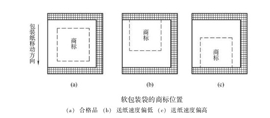 在包裝作業(yè)過程中,卷筒半徑逐漸減小,包裝紙所受張力發(fā)生變化,送紙輥與包裝紙之間的摩擦因數(shù)受環(huán)境溫濕度的影響而發(fā)生波動,加上商標(biāo)印刷誤差,以及送紙、縱封、橫封、切斷各部分速度的差異等因素,使得刀輥的實際切線偏離規(guī)定部位。即使這種位置誤差很小,例如在某—包裝袋上只偏差0.1mm,但包裝機(jī)速度很快,有的高達(dá)200包/min, 如不加以控制調(diào)節(jié),機(jī)器運(yùn)行1垃i六 后,誤差積累可達(dá)20mm,切線嚴(yán)重偏離規(guī)定部位,降低了包裝質(zhì)量,甚至造成廢品。如圖所示,圖(a)為合格品; 圖 (b) 為送紙速度偏低,商標(biāo)后移; 圖 (c) 為送紙速度偏高, 商標(biāo)前移。 為了保證包裝袋的正確封切, 必須在卷筒紙供送系統(tǒng)中, 引人商標(biāo)圖案自動位置檢測與控制系統(tǒng)。目前應(yīng)用廣泛的是光電自動定位系統(tǒng)。